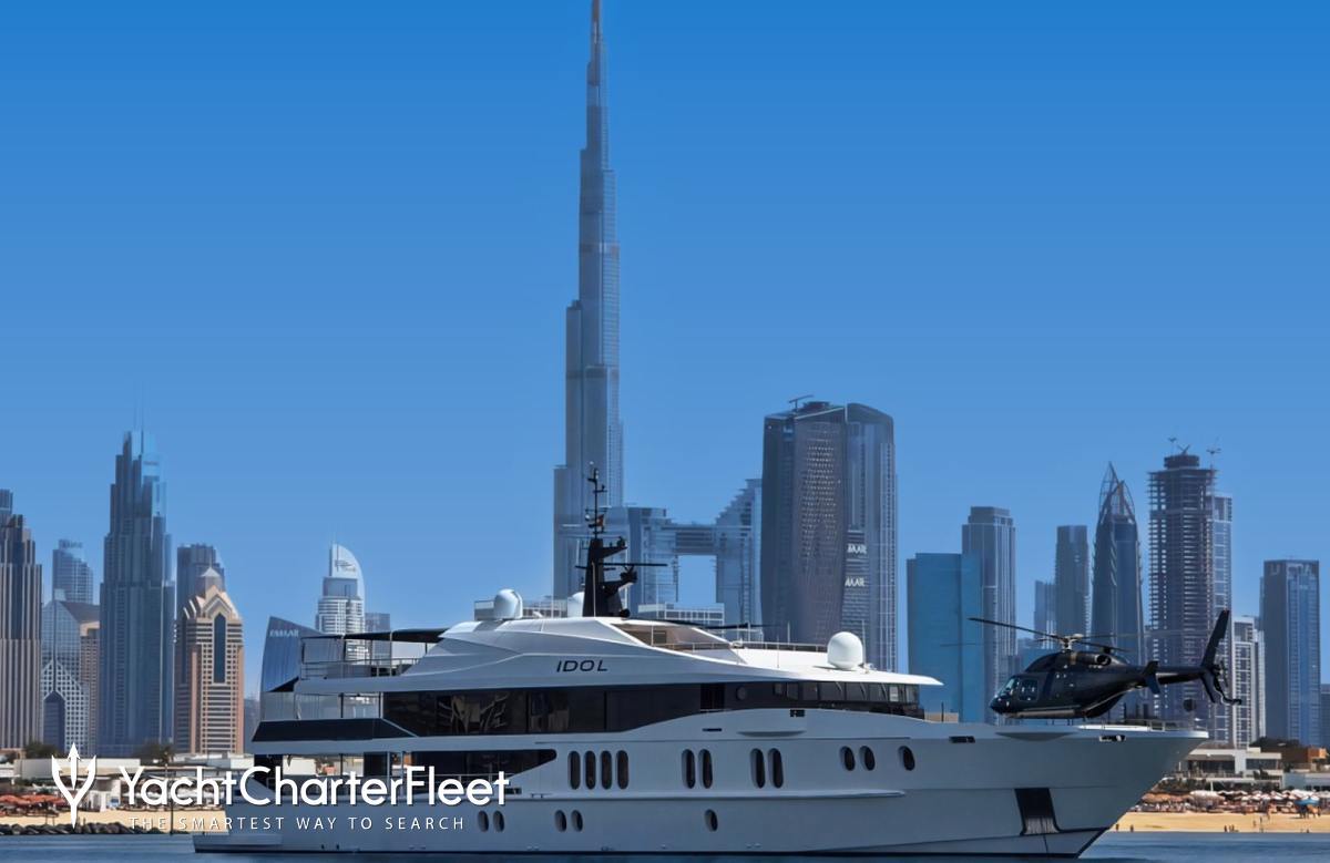 The luxury motor yacht Idol is displayed on this page merely for informational purposes and she is not necessarily available for yacht charter or for sale, nor is she represented or marketed in anyway by Trident Media Ltd. This document is not contractual. The yacht particulars displayed in the results above are displayed in good faith and whilst believed to be correct are not guaranteed, please check with your yacht charter broker. Trident Media Ltd does not warrant or assume any legal liability or responsibility for the accuracy, completeness, or usefulness of any information and/or images displayed as they may not be current. All boat information is subject to change without prior notice and is without warranty.