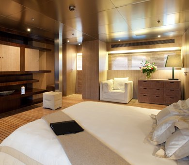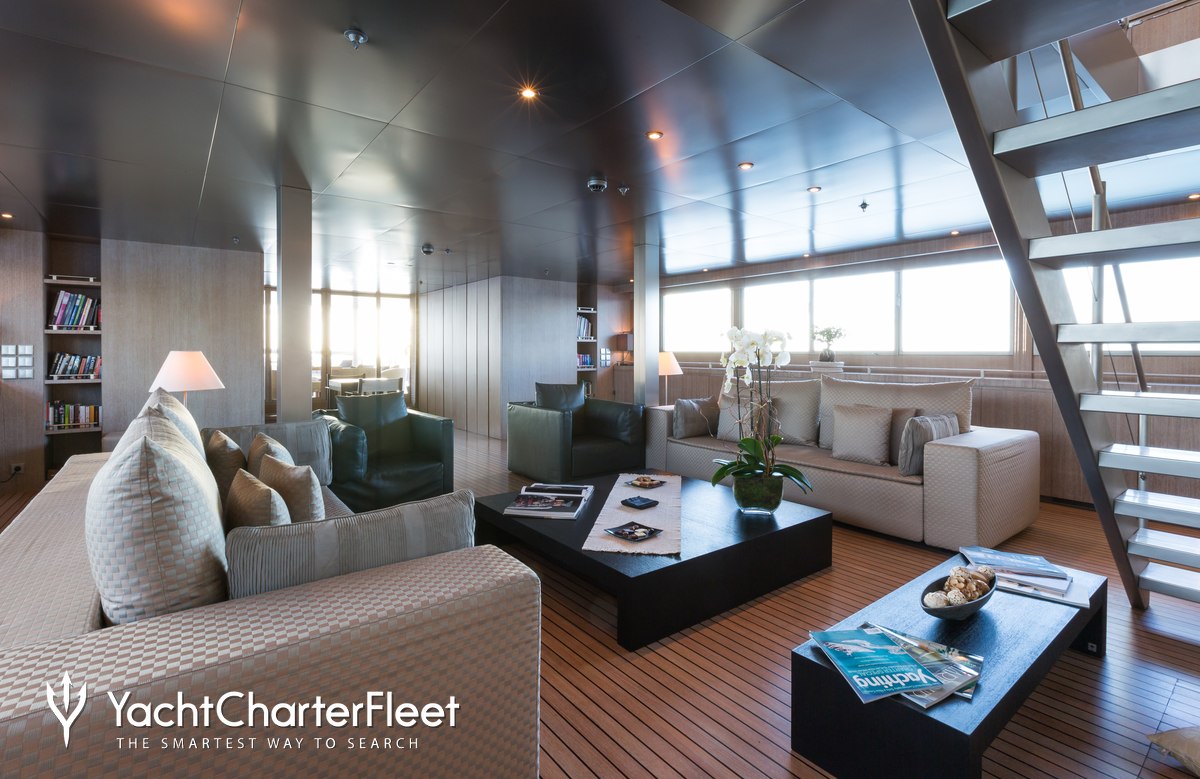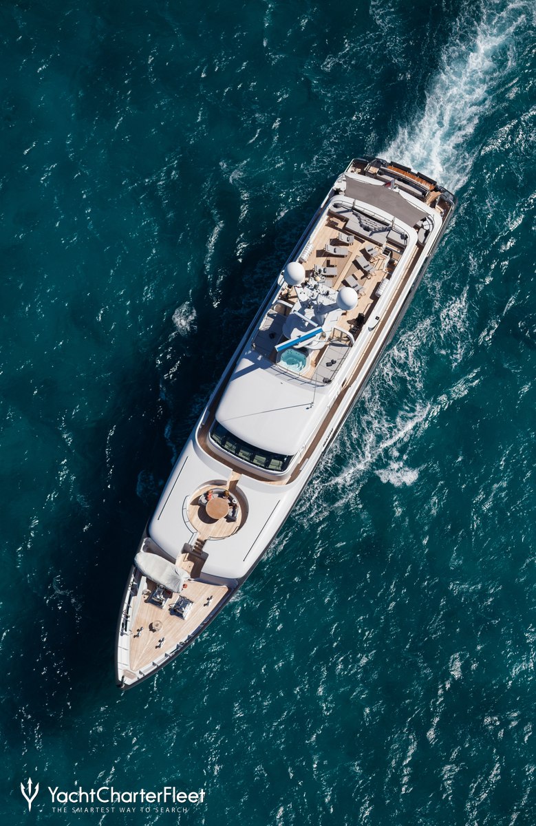 Built with a steel hull and aluminium superstructure, she benefits from a semi-displacement hull to provide exceptional seakeeping and impressive speeds. Powered by twin Caterpillar engines, she comfortably cruises at 14 knots, reaches a maximum speed of 17 knots with a range of up to 46,000 nautical miles from her 120,000 litre fuel tanks at cruising speed. An advanced stabilisation system on board reduces the side-to-side roll of the yacht and promises guests exceptional comfort levels at anchor or when underway.