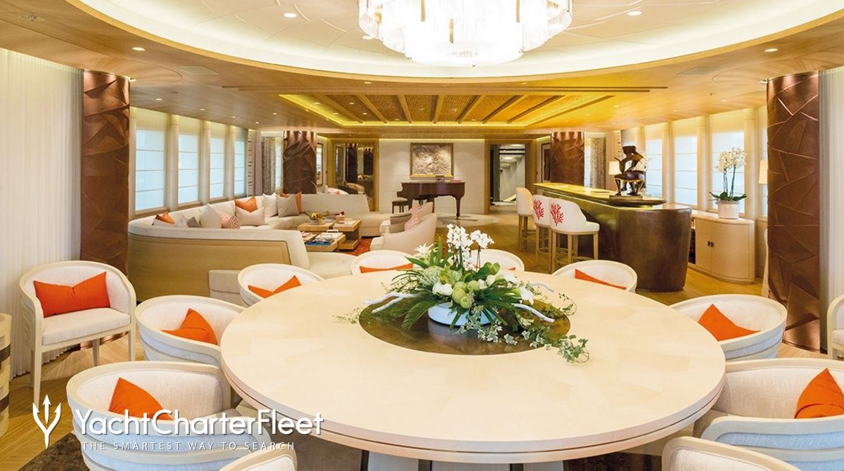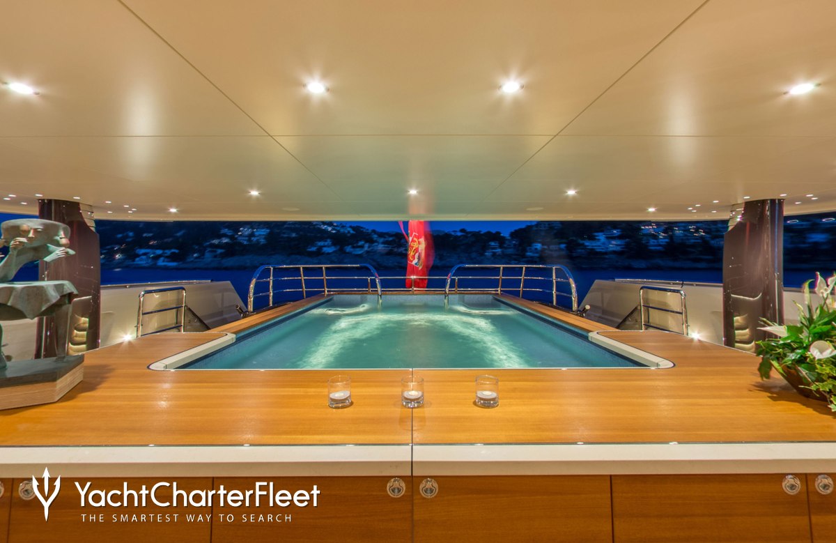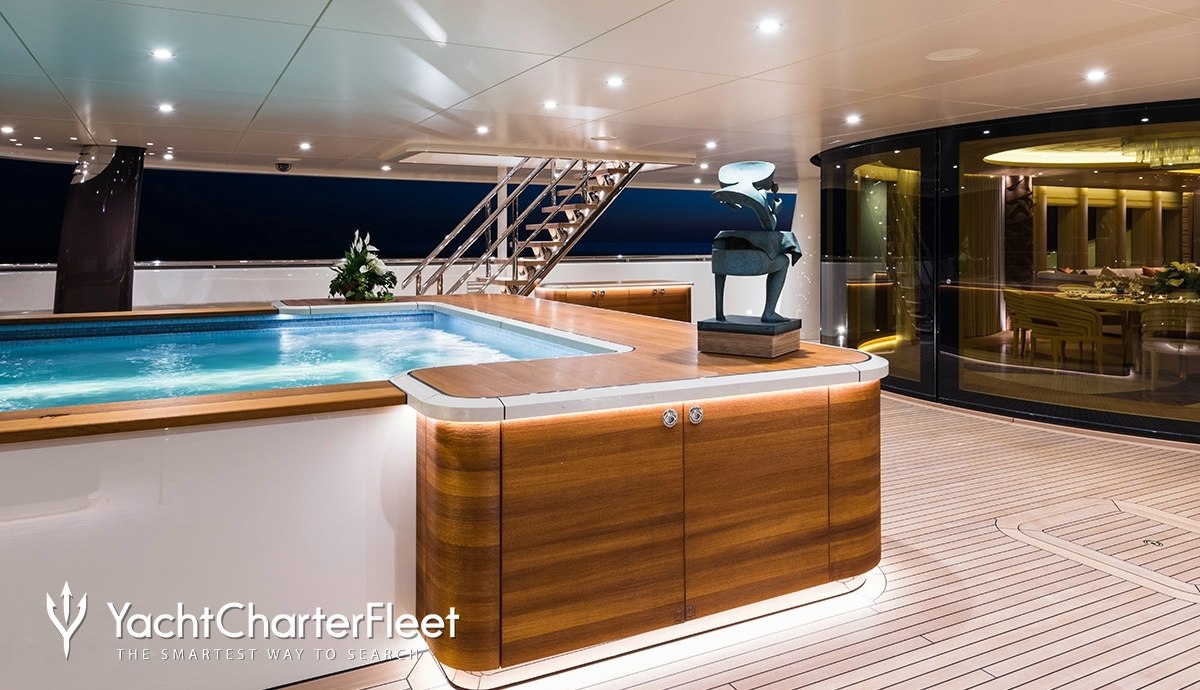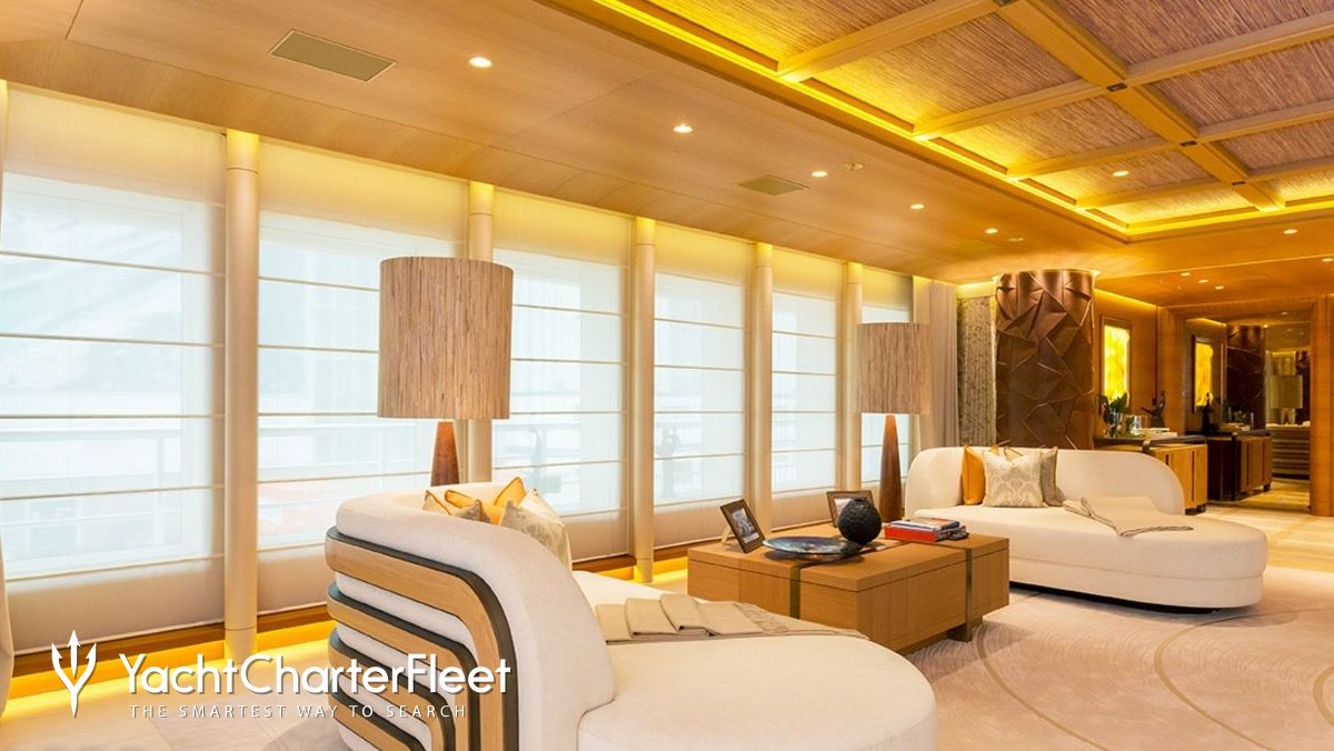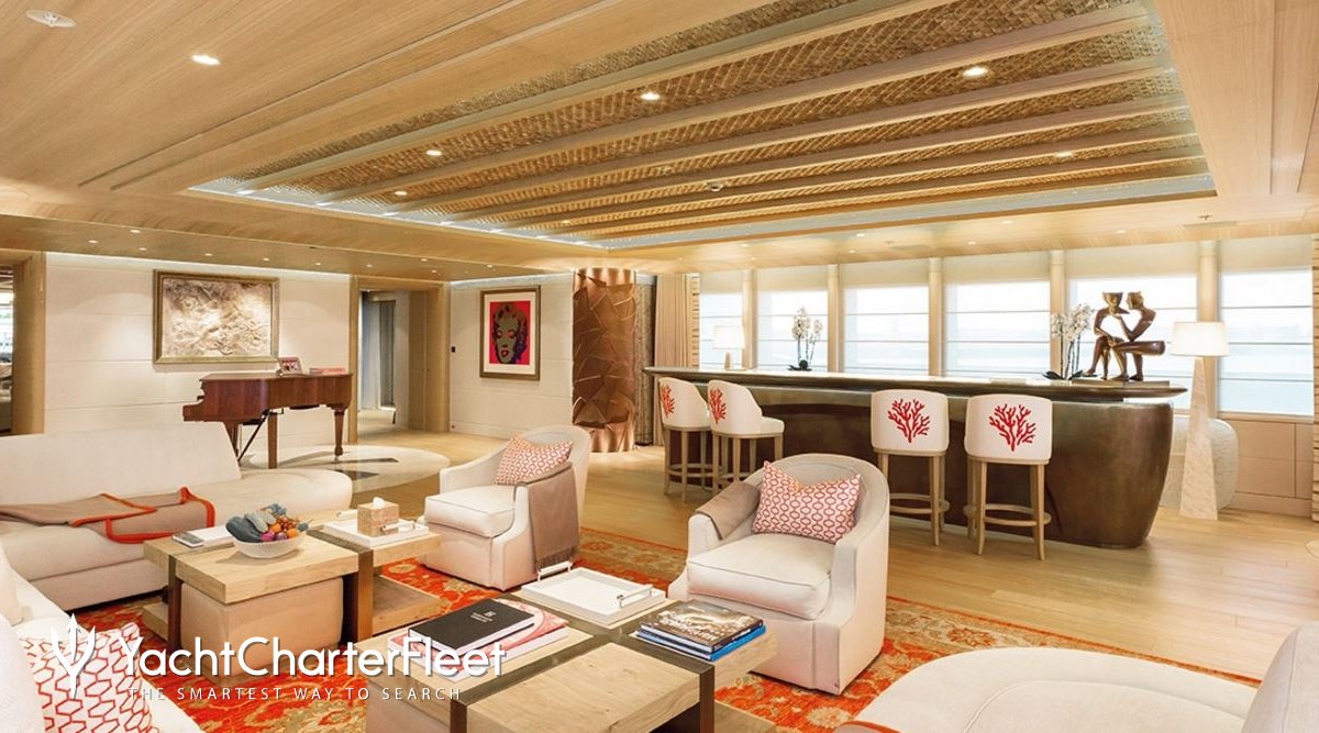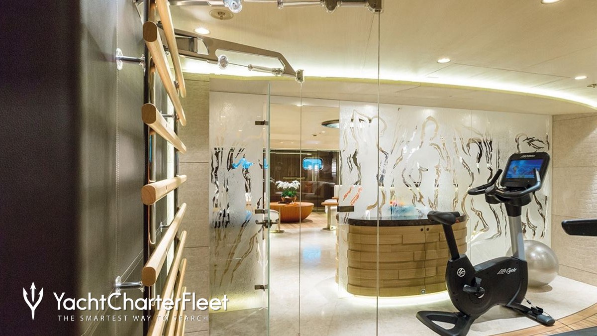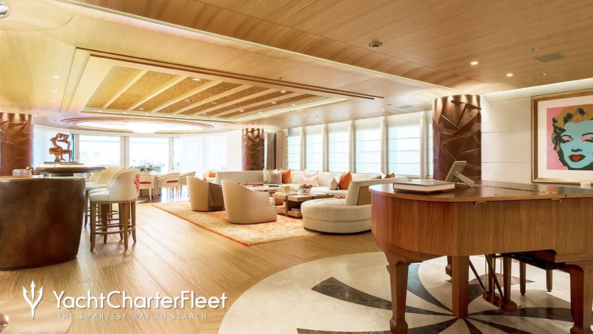 Her features include piano, spa, beauty salon, satellite communications, underwater lights, beach club, gym, deck jacuzzi, WiFi and air conditioning.