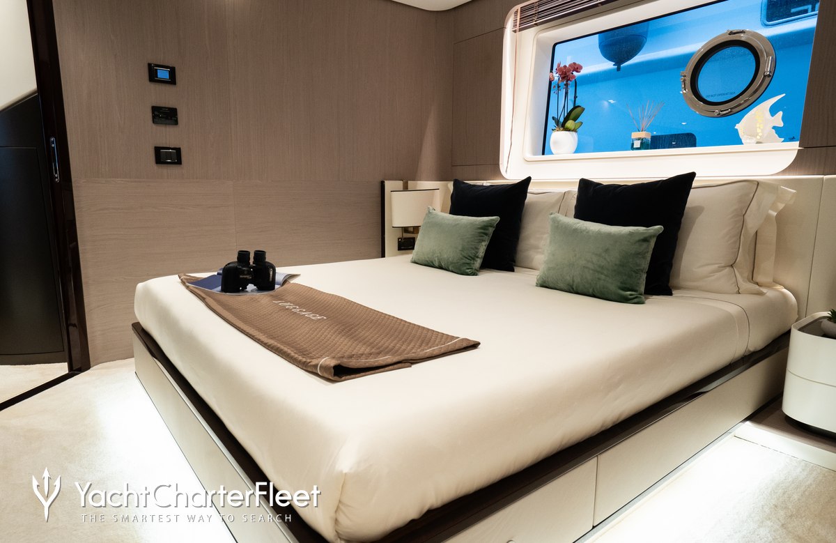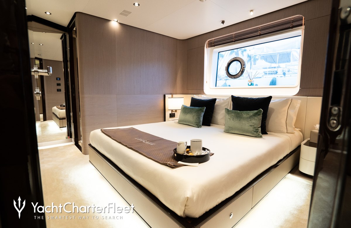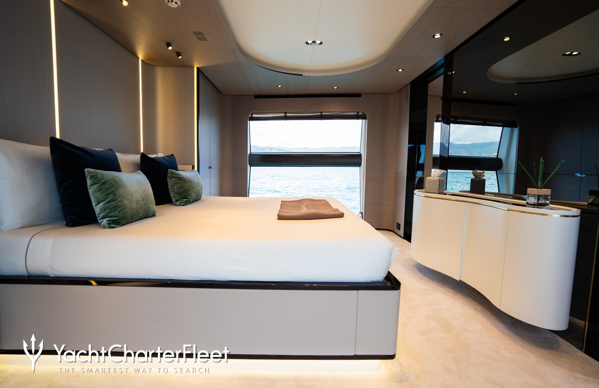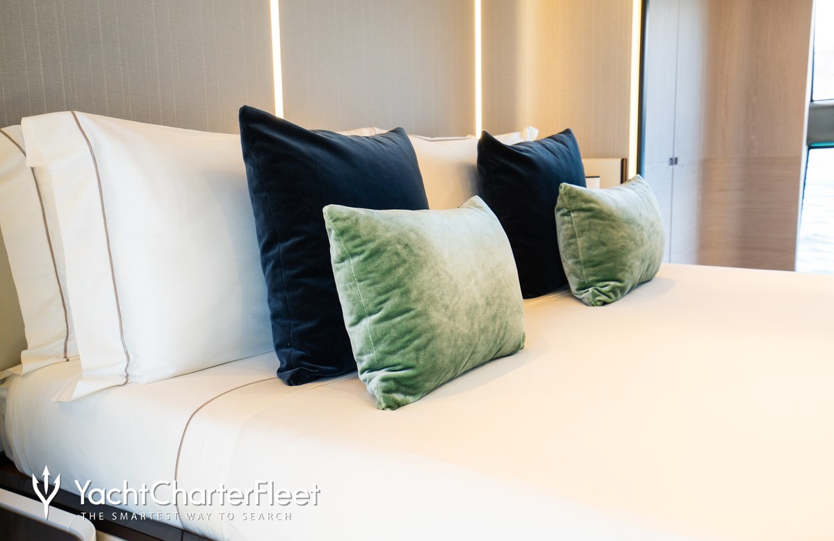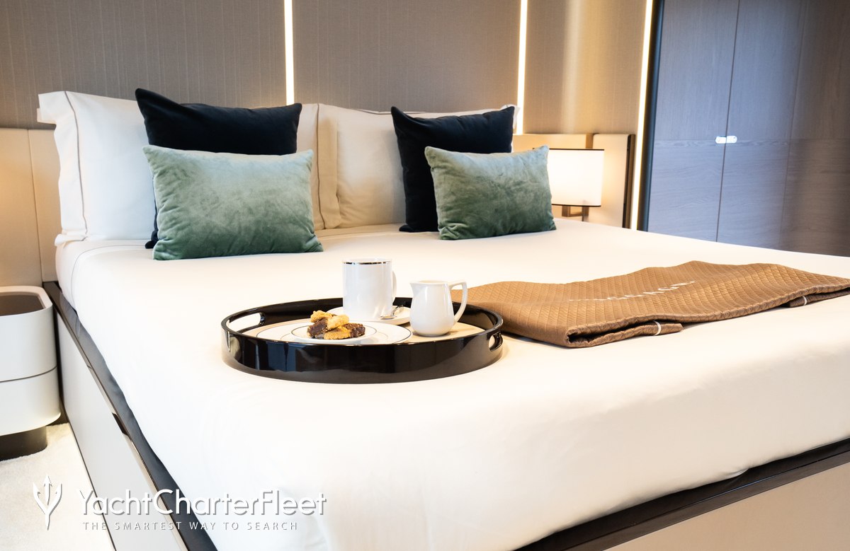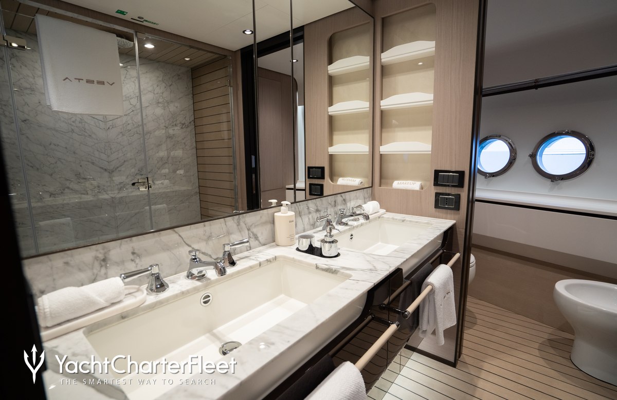 Vesta offers guest accommodation for up to 10 guests in 5 suites comprising a master suite located on the main deck, two VIP cabins and two twin cabins. The supremely spacious full beam master suite features extensive storage space provided by the dressing room. There are 7 beds in total, including 1 king, 2 queen and 4 singles. She is also capable of carrying up to 4 crew onboard to ensure a relaxed luxury yacht charter experience.
