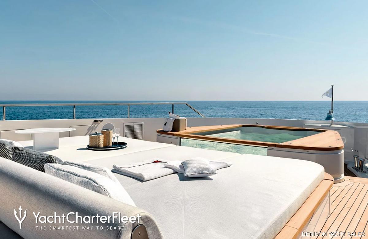 Keeping comfortable and entertained on Angel is easy thanks to the available amenities, notably a deck jacuzzi, perfect to enjoy the scenery with your favourite drink in hand.