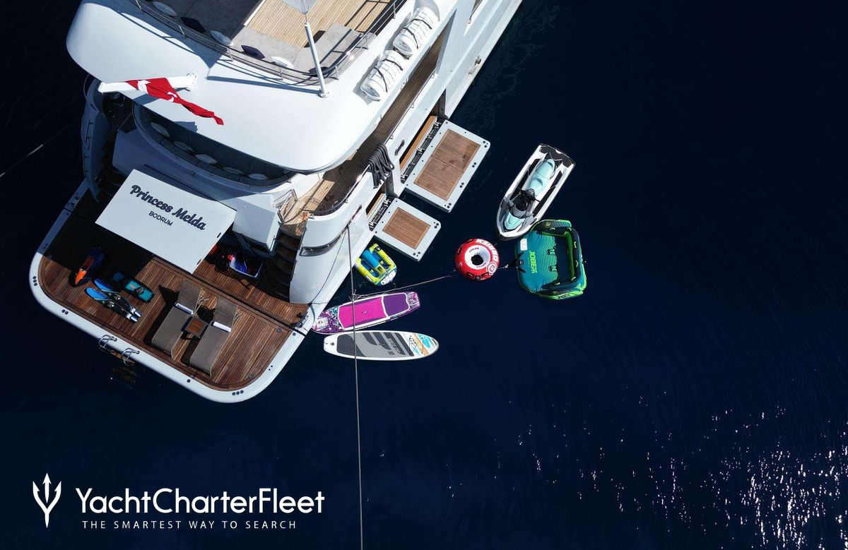 When not cruising Princess Melda has onboard an incredible selection of water toys and accessories for you and your guests to connect with the waters around you. Take to the sea on the Jet Skis offering you power and control on the water. Another excellent feature are waterskis that are hugely entertaining whether you are a beginner or a seasoned pro. Also there are wakeboards so guests can show off at speed. If that isn't enough Princess Melda also features canoes, fishing equipment, paddleboards and snorkelling equipment. When it comes to Tenders, Princess Melda has you covered - with two tenders, including a Tender.