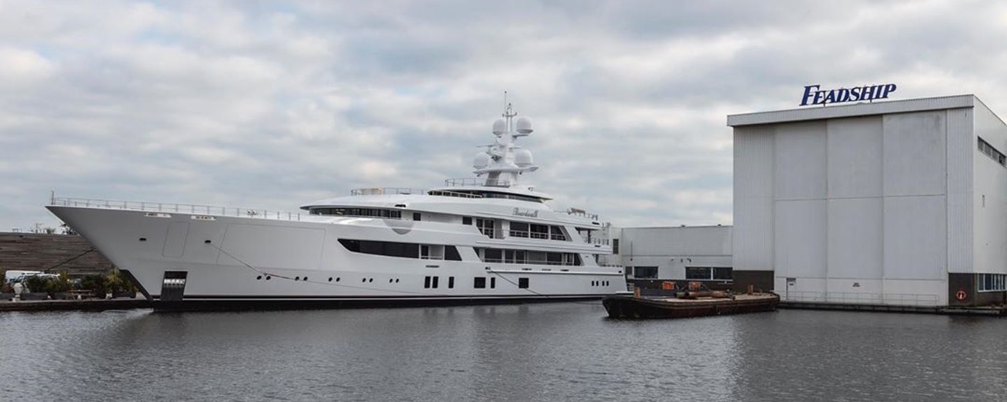 The superyacht exited the Dutch builder’s facilities after the final stages of her outfitting were completed earlier this week with the installation of a communications mask. She is now heading to the North Sea to begin her sea trials.