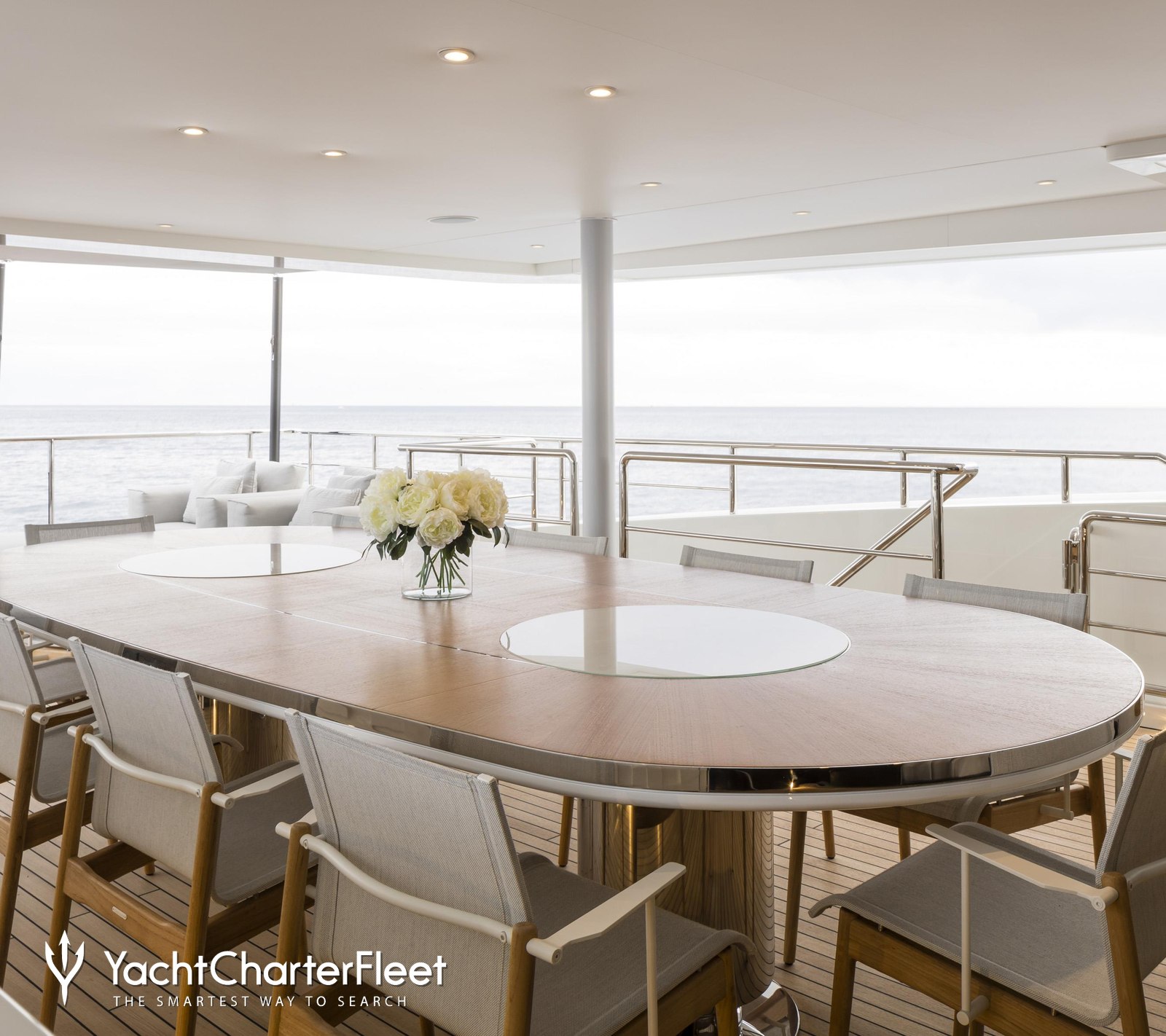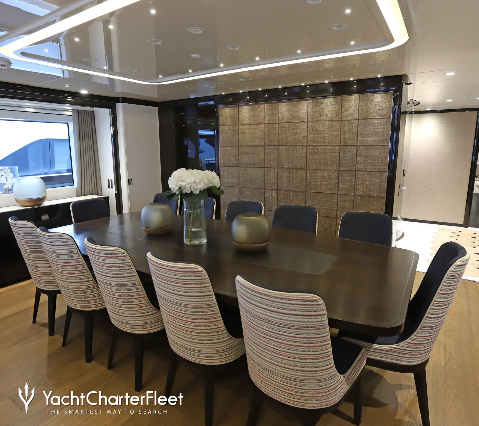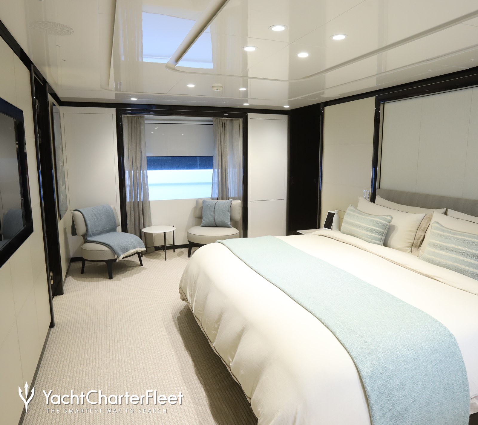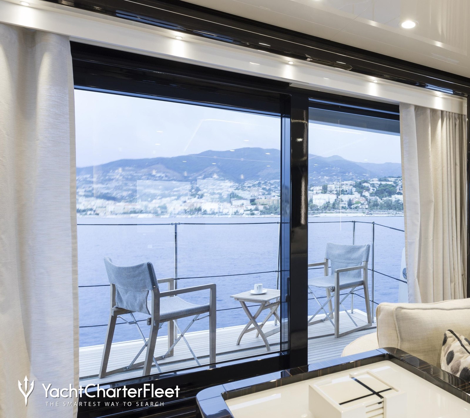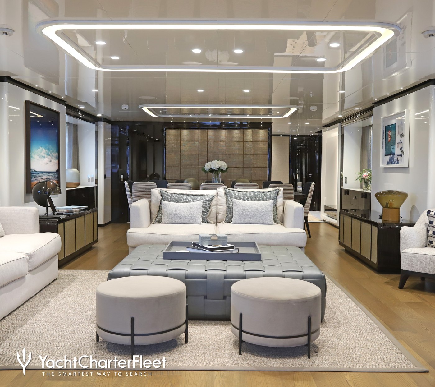 The main salon is arranged as a comfortable social space, with natural light helping to open up the interior. The design avoids overly formal elements, instead creating an environment that works well for both short stays and longer charters.