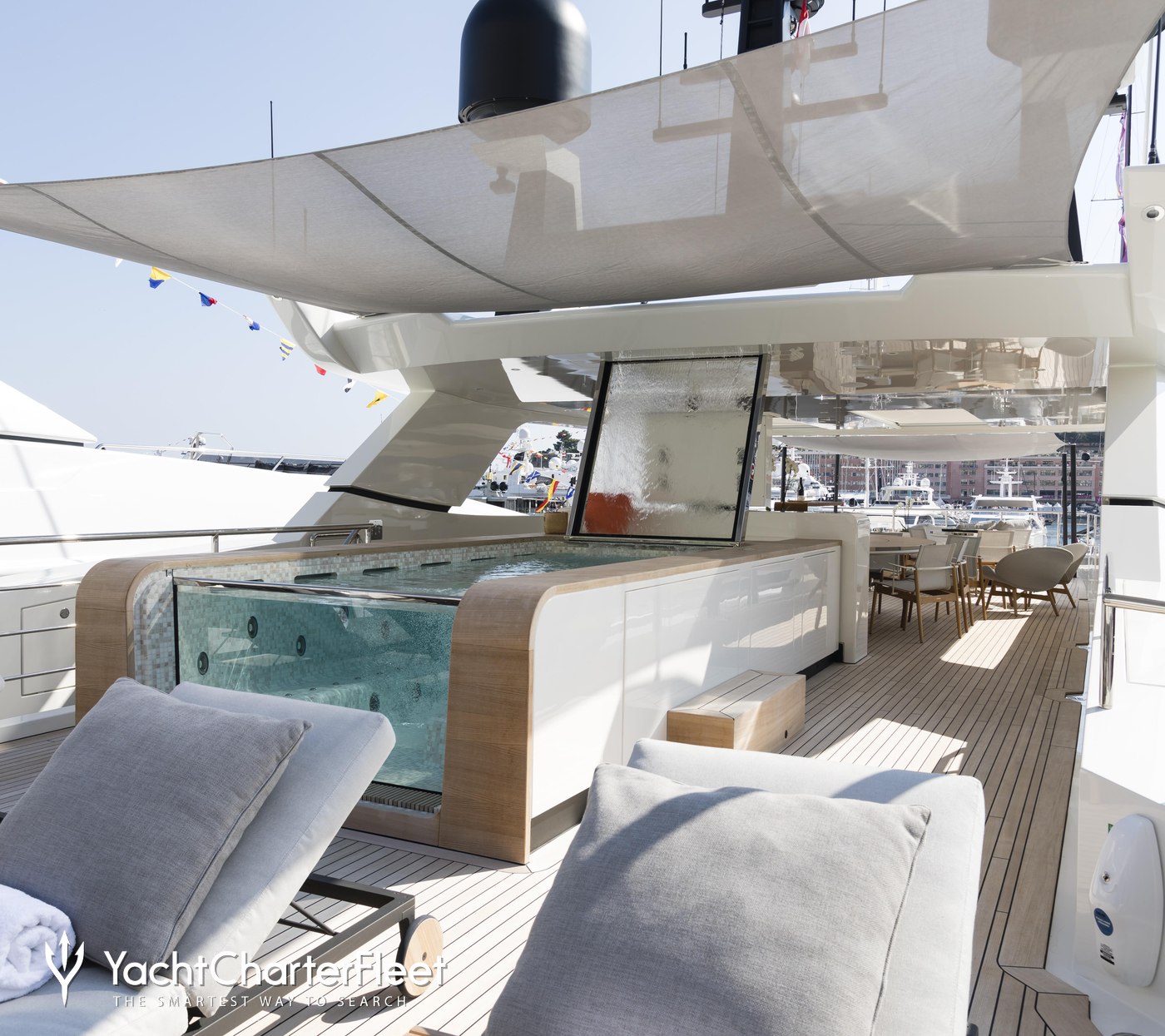 A swimming pool on deck provides an additional space to cool off, while surrounding seating and sunpads create a central area for gathering during the day. Multiple deck levels offer different vantage points, whether for dining, relaxing, or spending time underway.