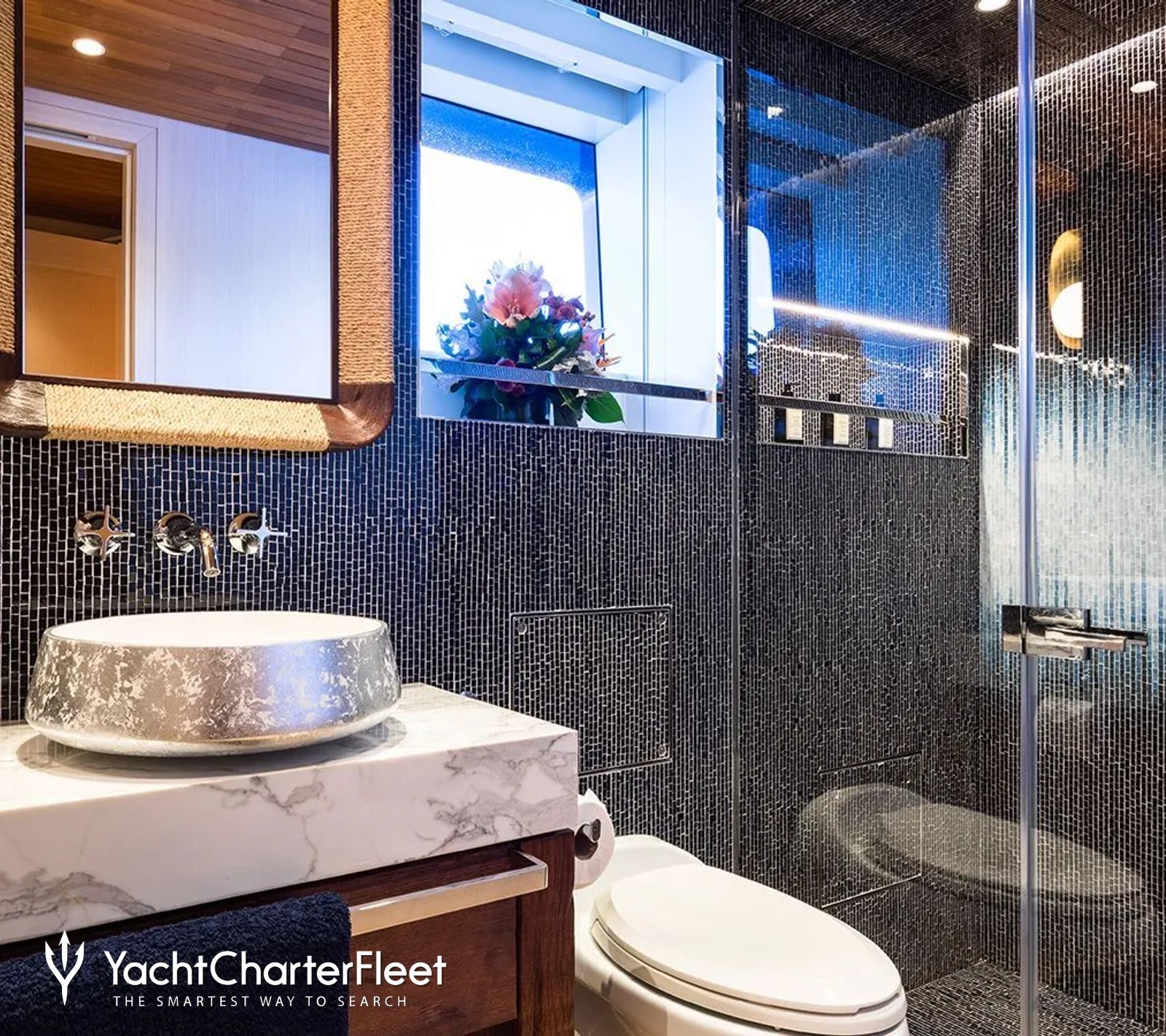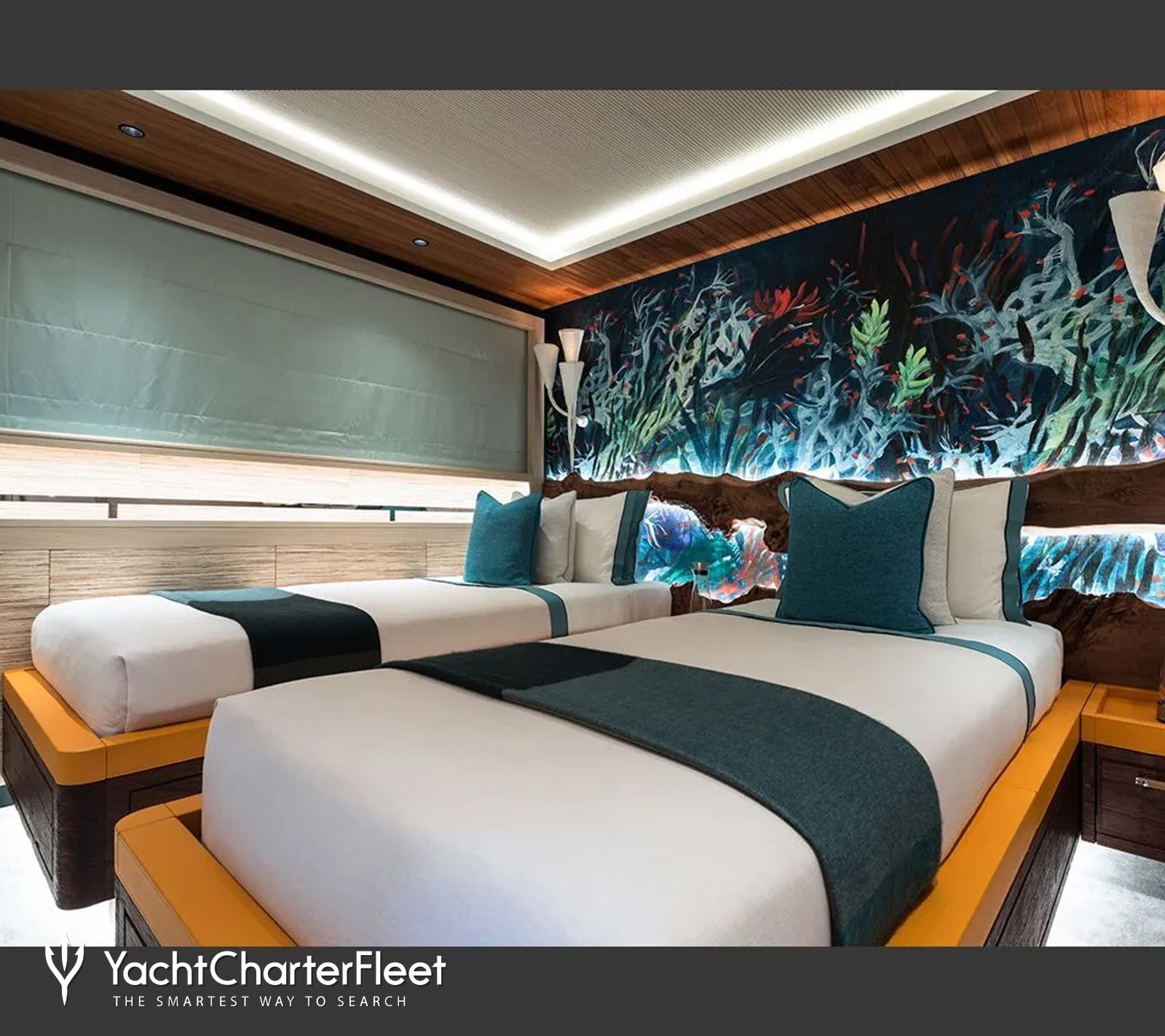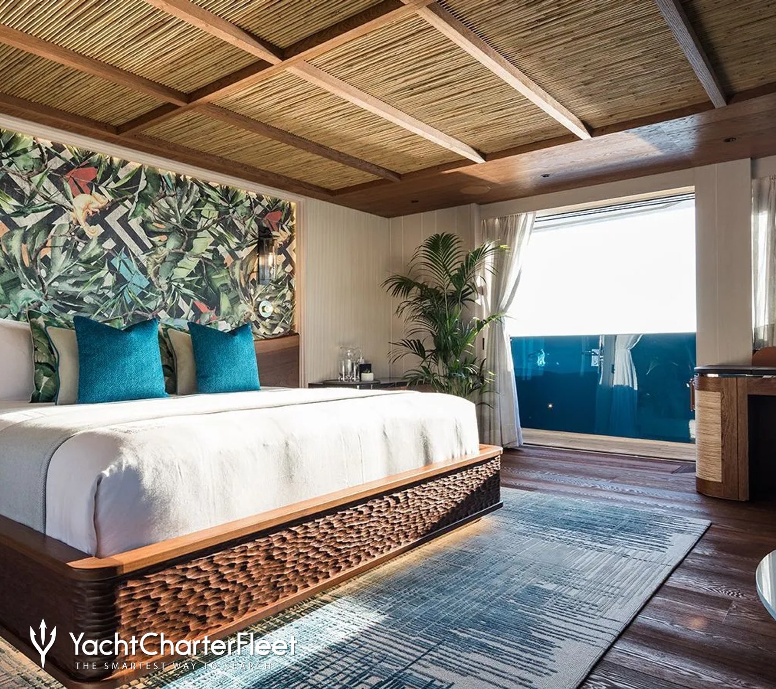 Accommodating up to 10 guests across five cabins, with a layout comprising a full-beam master, three double cabins, and one twin, KING BENJI has a unique versatility where she is suitable for a broad range of charter groups who are looking to explore the hotspots of the Med, or venture further to the shallow shores of a Bahamas yacht charter in the winter.