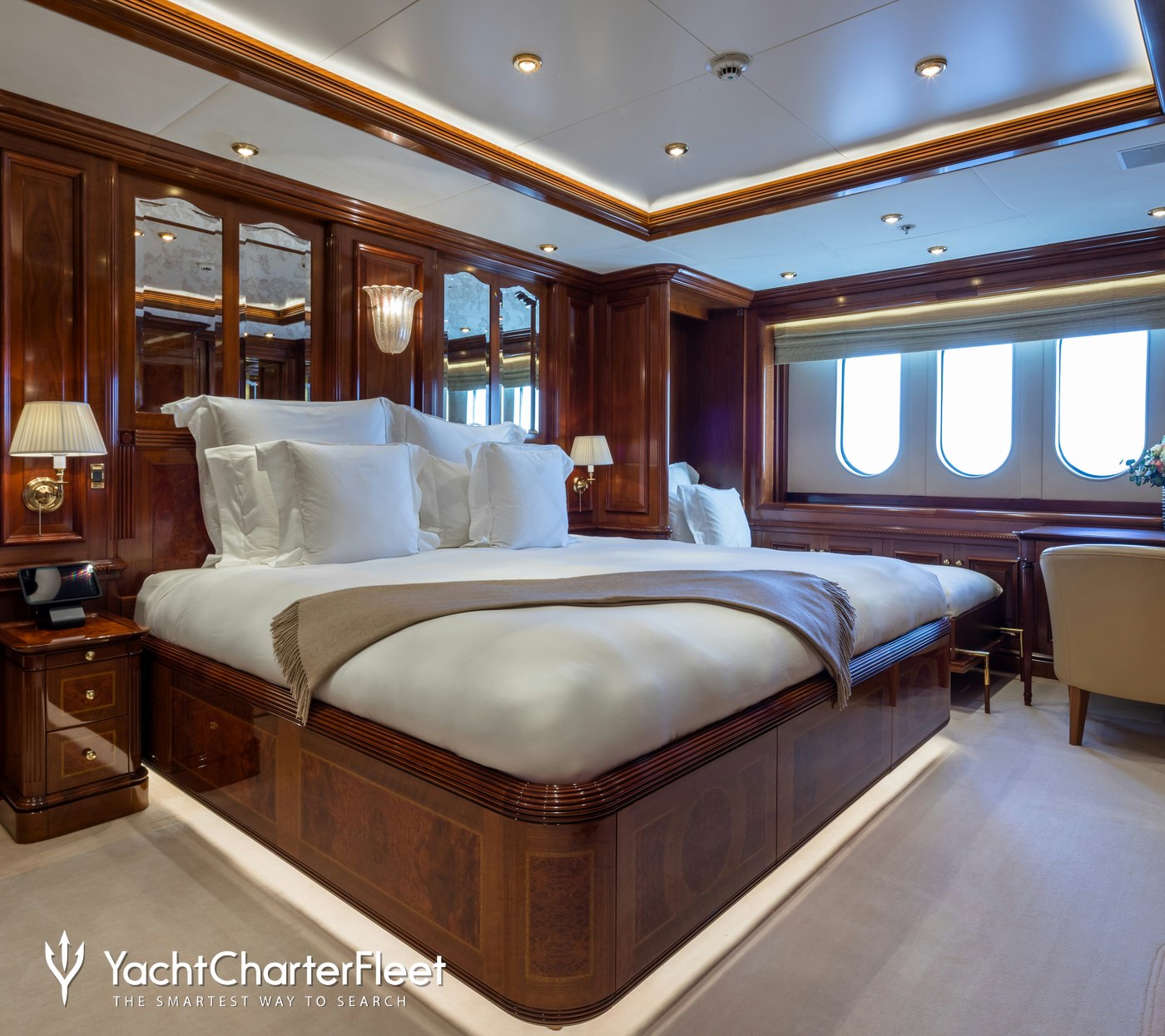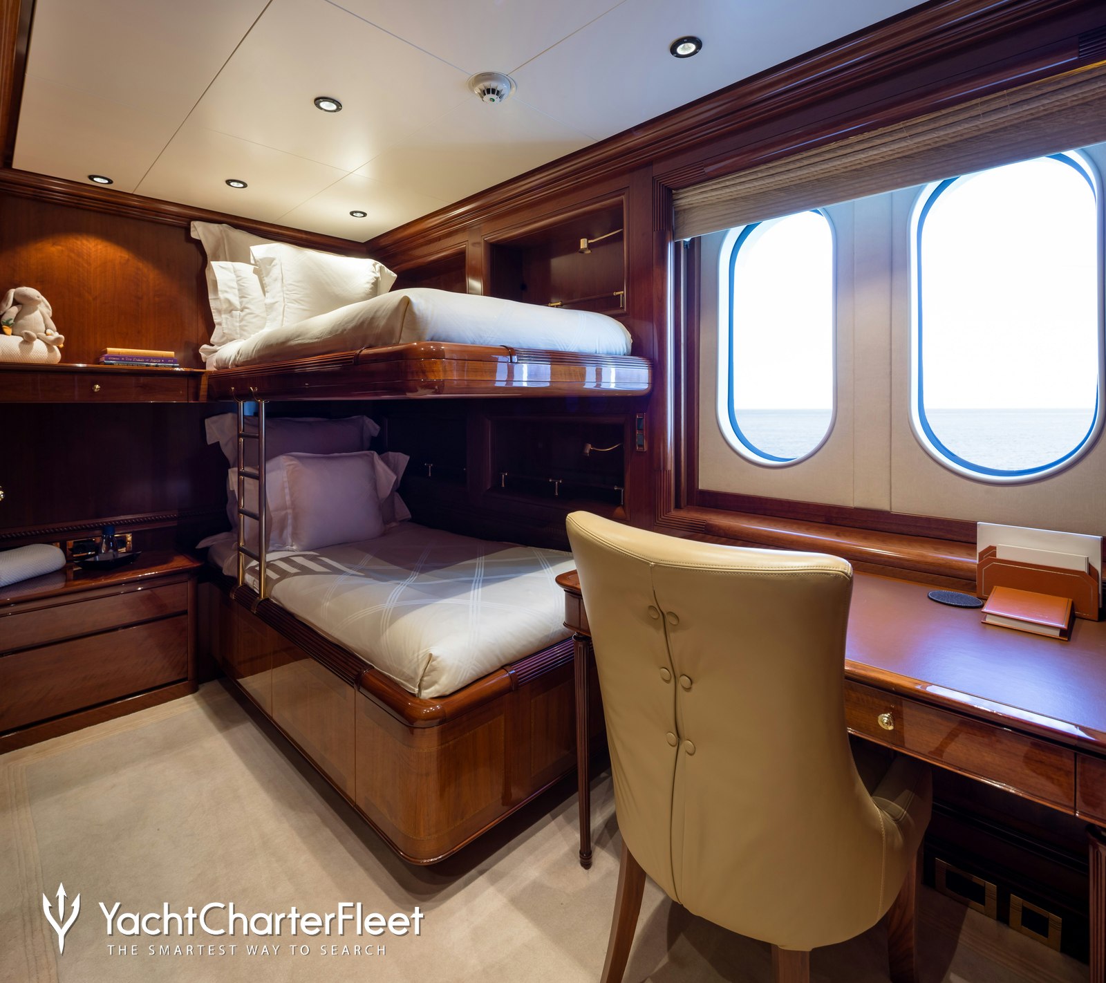 Completing the onboard experience, overnight accommodation caters up to 12 sleeping charter guests in a seven-cabin layout comprising a spacious full-beam master cabin complete with its own private study and dressing room, a VIP, a pair of doubles, a twin, and two triple cabins.