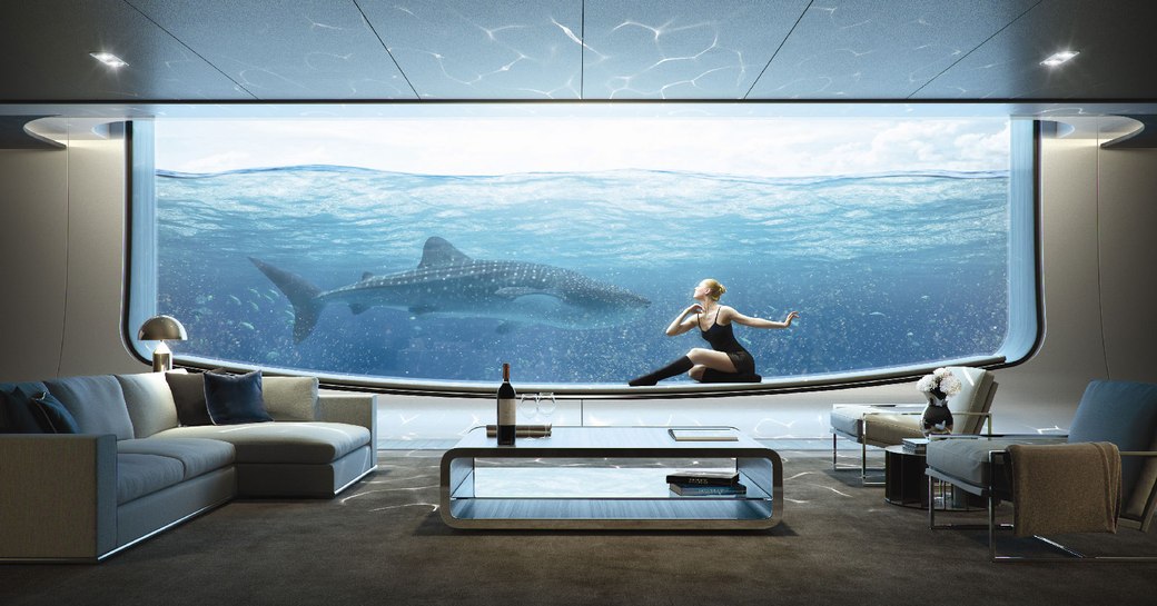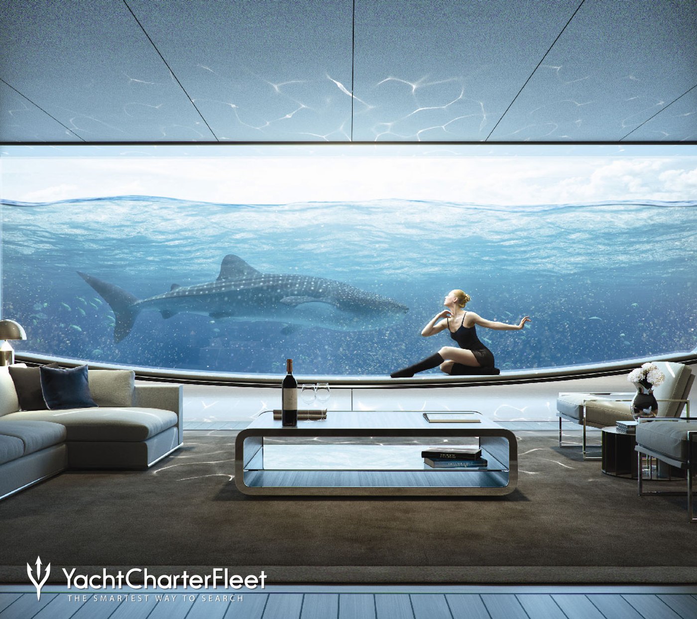 Due to its position in the hull, the lounge is composed of especially thick glass and can also transform into a cinema.